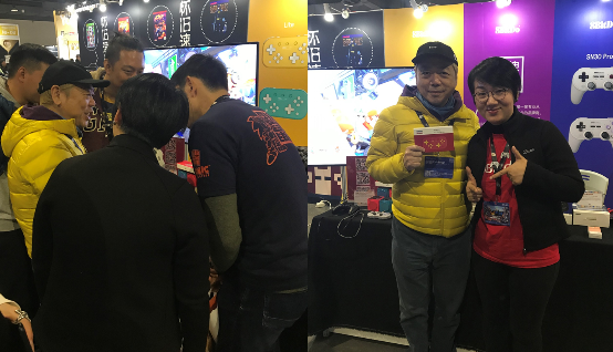 因为八位堂提前预告了 Zero 2 的参展,现场还吸引了非常多的大咖来八位堂展台打卡,体验产品,进行游戏交流,并和游戏玩家们展开互动。游戏爱好者也纷纷与游戏大咖们合影留念。知名的日本游戏人溝口功也来到展台前,参与体验试玩,和玩家交流互动。