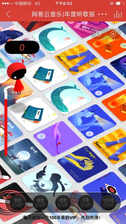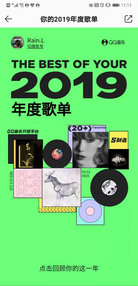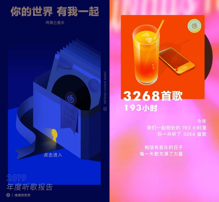 2019年12月30日,网易云音乐推出2019年度听歌报告,进入报告第一页是一张黑胶唱片,报告内容涵盖第一次使用时间、年度听歌时间、听歌排行、特殊听歌节点、听歌风格等,最后导向一个有机会赢得100年黑胶VIP的小游戏页面,内容设计和可玩性俱佳。
