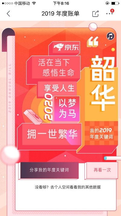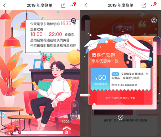 买单的快感难以长期持续,而电商平台的年度账单给“剁手党”又一记暴击。京东年度账单的画风和动画效果十分用心,紧扣用户相关数据,并赠送优惠券。这种玩法可以有效刺激用户在年货节的时候下单,同时也是进一步激活老用户的手段。