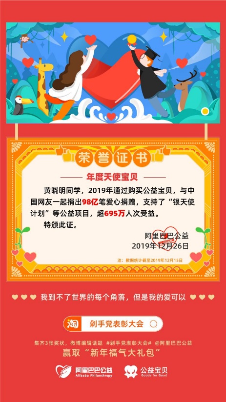 第一匹黑马来自淘宝的公益宝贝年度账单——“剁手党表彰大会”。公益宝贝年度账单在微博上共吸引了3000多万网友、以及十多位明星参与,掀起媒体传播高潮,其中最大的特色在于可以看到个人在“剁手”的同时做了多少公益项目。