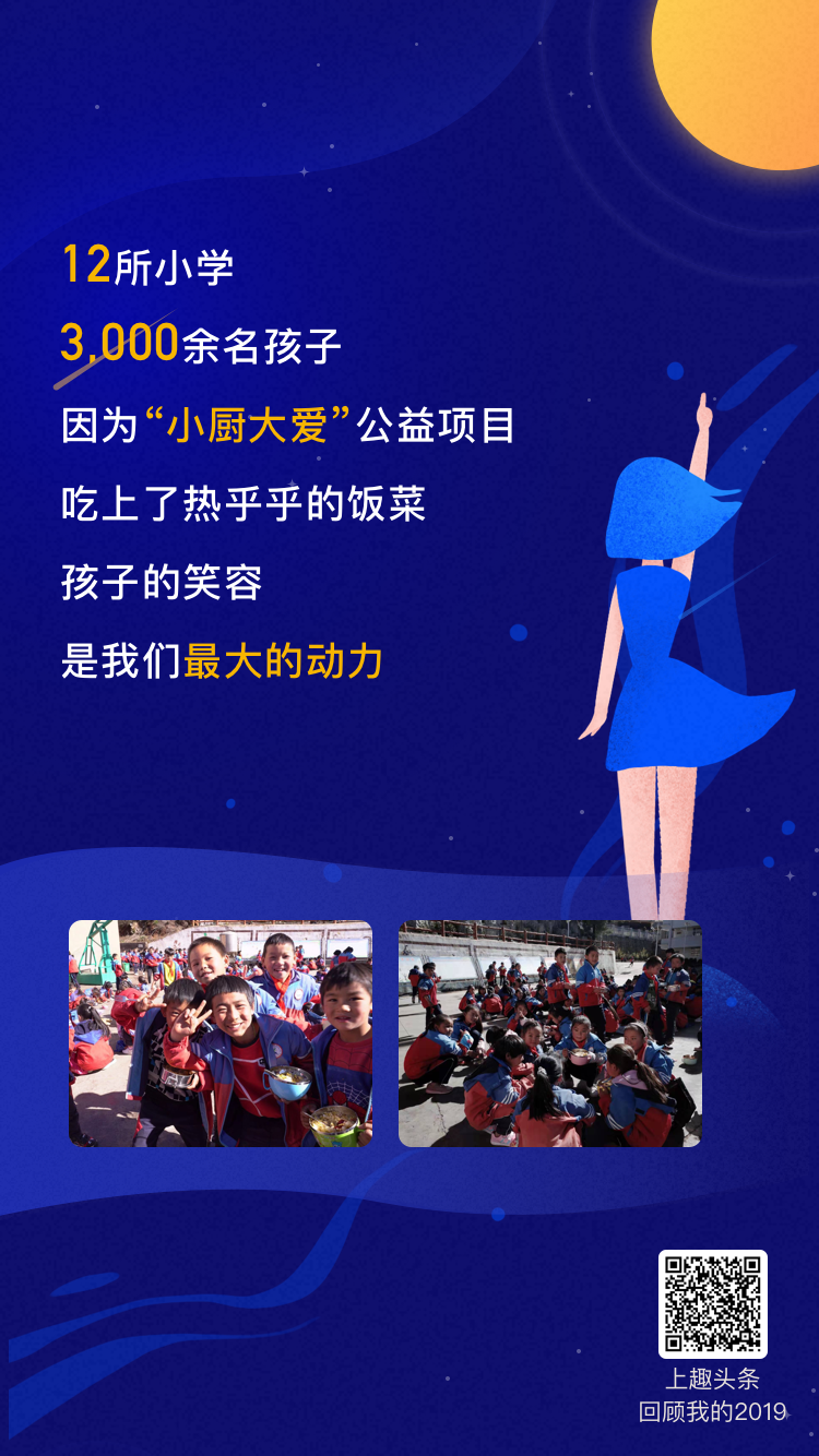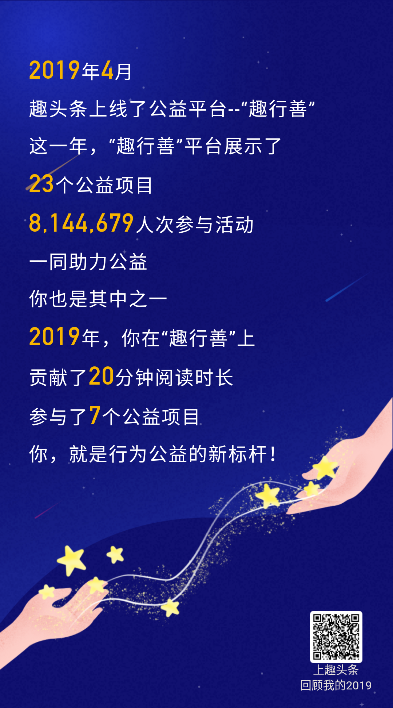 第二匹黑马来自趣头条推出的《趣头条2019年度回顾》,在2019十大新闻事件后,展示了用户在趣头条“趣行善”平台捐献的阅读时长及对应公益项目,体现出阅读资讯之外的乐趣和意义。这份年度回顾共吸引了超150万趣头条用户参与。