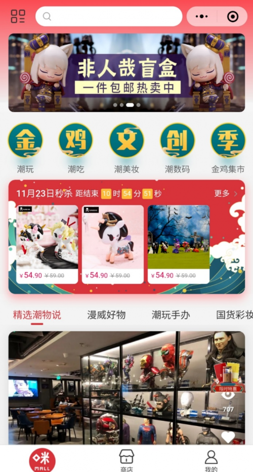 平台定位上,咪MALL聚焦国货、国潮、国际“三国”策略。一方面,咪MALL挖掘精品国产尖货,吸引了谢馥春、黄则和、毛戈平、初叁等众多耳熟能详的国货品牌入驻,并自研咪咕系产品,助力新国货崛起。另一方面,咪MALL立足当下潮流趋势,集结非人哉、罗小黑、tokidoki等热门系列盲盒、漫威、DC大牌手办等各类潮玩,引领新国潮。另外,通过与金鸡奖等活动的合作,让中国文化走向国际。