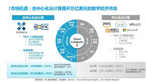 大家可以看到,2019年去中心化云计算是100亿美元市场,云存储有30亿美元市场,刚才我们已经提到在未来去中心化会大于中心化,如果说考虑到云计算、云存储本身有增长,那么两者有可能是二比一的增长比例。也许在未来10年、20年,去中心化云计算和云存储分别会有100倍的增长。也就是说从100亿美元增长100倍,达到万亿美元的市场规模。