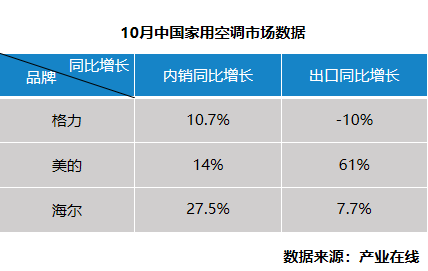 对比今年9月的数据,9月空调行业内外销合计同比增长5.0%,内销同比下降0.2%,外销同比增长16.5%。从数据比较看,今年10月空调市场整体向好,出口数据增长亮眼。