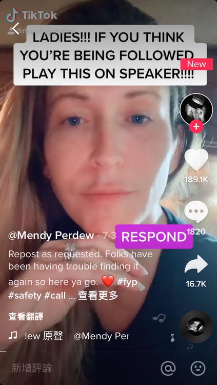 31岁的Kristie Bloss来自美国佛罗里达州。今年4月,她在For You页面看到了Mendy Perdew上传的一个“安全通话”视频,她立马转发了这条视频,以备不时之需。“有这些视频真是太好了。”Bloss表示,以前曾有人对她意图不轨,现在有了“安全通话”视频,她感到安心多了。