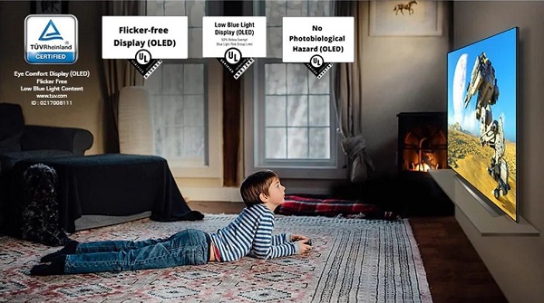 OLED电视没有液晶电视那样的背光源,是像素自发光技术,所以其蓝光放射量要比液晶电视少50%。而且因为没有背光源,OLED电视几乎不存在屏闪,被德国TUV莱茵和美国UL同时评为符合眼部舒适度的屏幕。