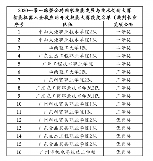 近日,2020一带一路暨金砖国家技能发展与技术创新大赛之智能机器人全栈应用开发技能大赛在中山火炬职院圆满落下帷幕。来自各地16支参赛队伍经过激烈的角逐,最终中山火炬职院两支代表队获得总分第一、第二名,囊括大赛两个一等奖,中山火炬职院和广州市威控机器人有限公司荣获大赛最佳组织奖、突出贡献奖。