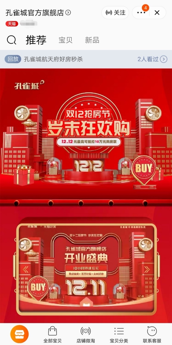 整个双12期间,孔雀城官方旗舰店五大重磅同步启幕,开启全新购房体验:20场官旗直播,实现一对多咨询,一对一砍价;尖叫好房折扣区,最好性价比孔雀城安家;更有底价促销区触底直降。只需要12.12元购置礼券,房款抵用券可以抵用1至20万优惠;赠礼抵用卷可以抵用车位、物业费、家电礼包;专属房源权益券可以购买线上专属房源;底价房权益券可以享受底价折扣权益。
