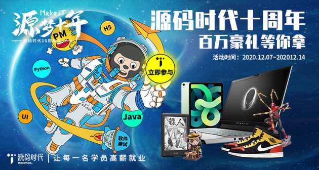 2010年,源码时代在积极促进落实国家“发展高科技,实现产业化”战略中应运而生。2020年,源码时代走过十年,作为实现产业升级与民族复兴的重要参与者,无论在稳定就业还是提供技术型人才等方面都为社会做了出巨大贡献,逐步成长为拥有超过十万毕业学子、1000家企业、上百所高校的成熟IT职业教育品牌。