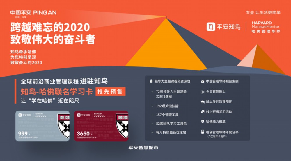 相关数据显示,80%的企业管理者将关键技能短缺视为对业务最大的威胁。针对企业培训存在的 “内容与业务不匹配 ”、“内容采购成本高”、“高管对前沿商业知识需求大”的痛点,平安智慧城市打造的平安知鸟携手哈佛商学院企业学习推出“平安知鸟-哈佛管理导师”联名学习卡,涵盖72项领导力主题课程、每日更新的管理贴士、157个可供下载的管理工具、600多个导师微视频和700多篇商业洞察文章等学习内容,为管理者赋能,帮助其应对挑战。