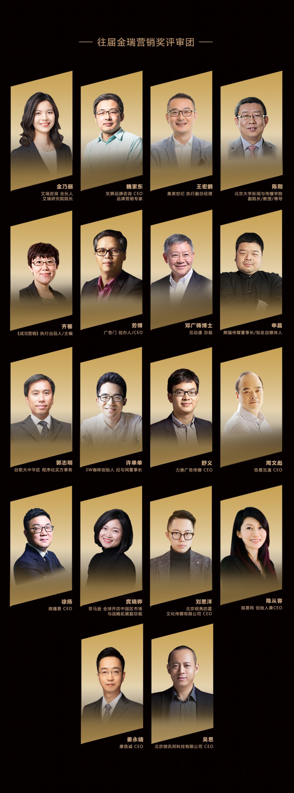 15年来,金瑞营销奖汇聚了中国营销界最具权威的理论和实战专家,以艾瑞视角诚邀行业各类平台综合性嘉宾,往届评审团汇聚行业精英,如:陈刚(北京大学新闻与传播学院副院长/教授/博导)、申晨(熊猫传媒董事长/知名自媒体人)、郭志明(谷歌大中华区程序化买方事务)、劳博(广告门创办人/CEO)、齐馨(《成功营销》执行出品人/主编)、许单单(3W咖啡创始人/拉勾网董事长)、邓广梼博士(互动通总裁)、王宏鹏(奥美世纪执行副总经理)、魏家乐(东狮品牌咨询CEO/品牌营销专家)、金乃丽(艾瑞咨询合伙人/艾瑞研究院院长)等。
