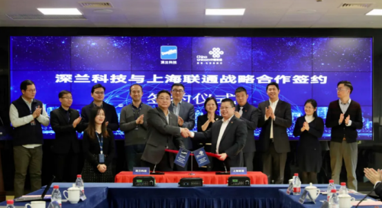 上海联通副总经理戴苓,上海联通政企客户事业部总经理胡卫东,深兰科技创始人、董事长陈海波,深兰科技董事副总裁赵旭,深兰科技副总裁何犹卿等出席签约仪式。