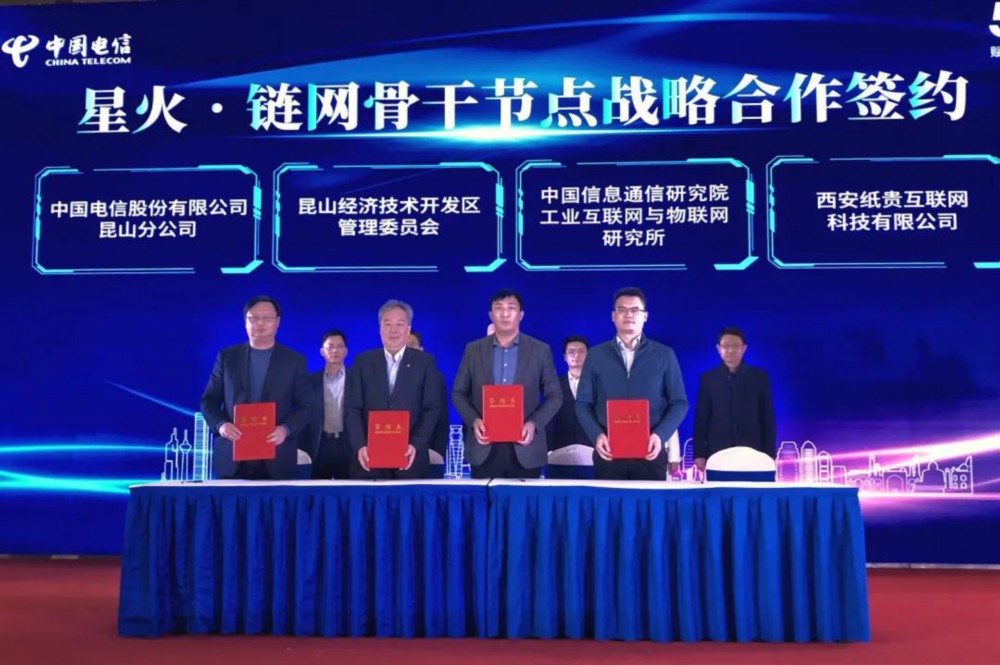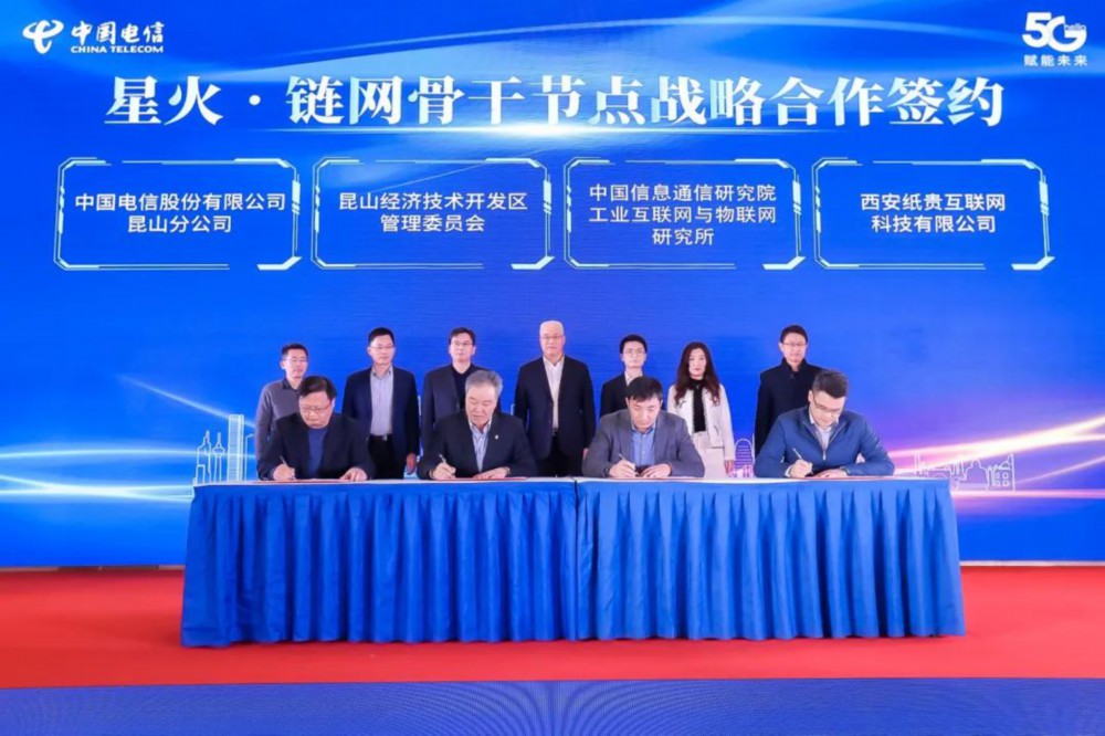 论坛现场,西安纸贵互联网科技有限公司(简称:纸贵科技)与中国电信股份有限公司昆山分公司、昆山经济技术开发区管理委员会、中国信息通信研究院工业互联网与物联网研究所共同签署了“星火·链网”骨干节点战略合作协议。这是“星火·链网”在华东地区的首个骨干节点落户项目,也标志着昆山成为全国首个落地“星火·链网”骨干节点的县级市。