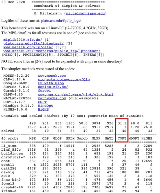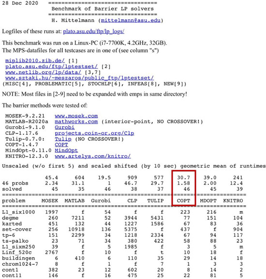 图一:COPT在Mittelmann线性规划单纯形法榜单继续全球第一