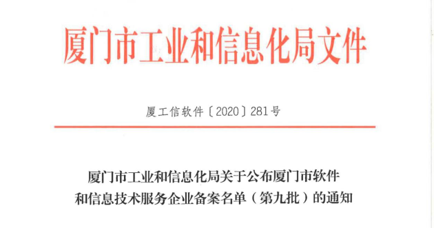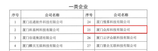 2020年11月27日,经企业申报、材料审查、专家评审、社会公示等环节,众库科技通过厦门市软件和信息技术服务企业备案,获得一类企业认证。