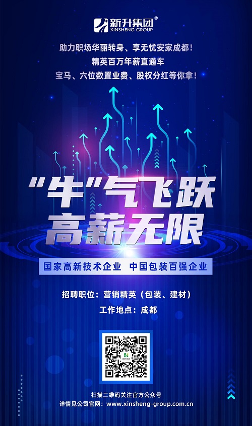 四川新升投资集团作为“国家高新技术企业”、“中国包装百强企业”,通过创新驱动,推动包装行业转型升级,现高薪聘请营销精英人才,稳抓市场红利,力争打造行业龙头企业。
