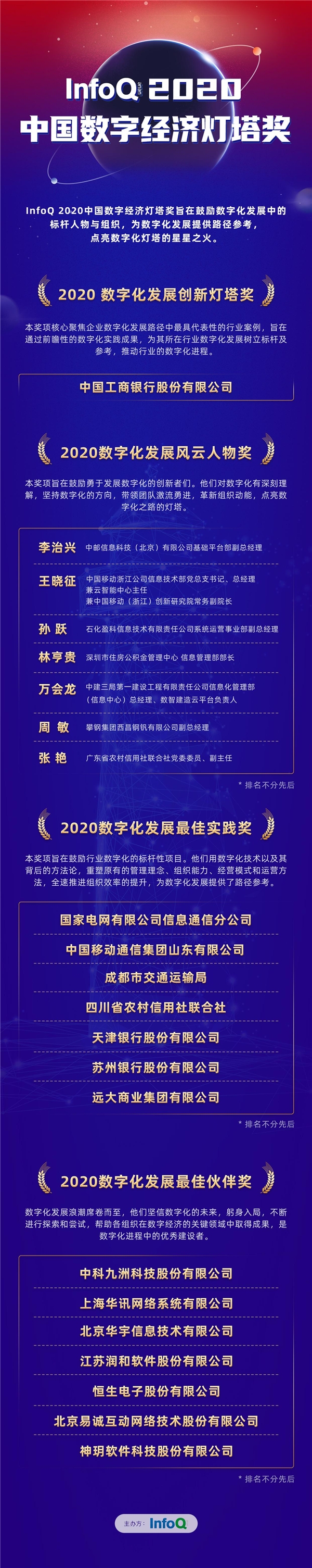 本奖项从2020年度开始,由来自各个领域的数十位专家从各个维度展开评审。此次InfoQ 2020中国数字经济灯塔奖共分为2020 数字化发展创新灯塔奖、2020 数字化发展风云人物奖、2020 数字化发展最佳实践奖、2020 数字化发展最佳伙伴奖这4个奖项,以下为获奖名单: