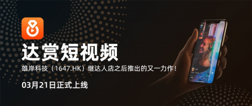 3月21日凌晨,香港主板上市公司雄岸科技(01647.HK)旗下的“达赏”APP准时上线,雄岸科技CEO李伟表示,达赏是整个集团继达人店之后全力打造的具有趋势引领地位的社交短视频平台,将会像达人店奠定诸多社交零售行业标准一样,带动一个新的行业风口。