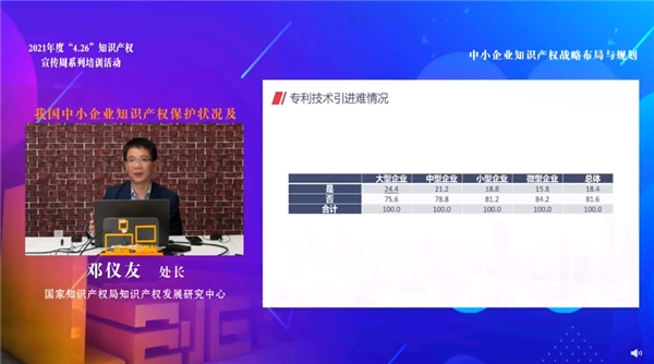 国家知识产权局国家知识产权发展研究中心邓仪友处长讲解了我国中小企业知识产权保护状况及高质量发展政策建议。邓仪友处长强调我国中小企业是国民经济和社会发展的生力军,是推动经济实现高质量发展的重要基础,是扩大就业、改善民生的重要支撑。目前,从知识产权状况看我国中小企业的生存与发展,面临着产业链控制力较弱、市场控制能力不稳定、可持续空间动力不足等诸多问题。邓仪友处长建议一是制定知识产权基本法,将知识产权保护理念和要求贯彻法律体系之中。二是广泛寻求智库、行业协会、专业机构的协助,提高我国政府和市场在知识产权保护上合作的广度与深度。三是加强海外知识产权保护状况调查以及应对工作。四是将知识产权服务列入政府公共服务购买事项清单。