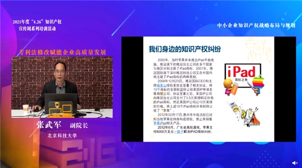 4月8日,2021年度“4.26”知识产权宣传周系列培训首场活动在朝阳区电子城高科创E+园区成功举办,本次活动由朝阳区市场监督管理局(知识产权局)主办,中关村智汇产业技术研究所承办,创E+、微博直播、映客直播、IPRDAILY、中国技术交易所、创新工场协办,同时得到了中关村社会组织联合会的大力支持。活动围绕中小企业知识产权战略布局与规划,邀请国家知识产权发展研究中心邓仪友处长、北京科技大学张武军副院长、中国专利保护协会李满宇主任、朝阳区知识产权服务中心李莹老师分别讲解我国中小企业知识产权保护状况、专利法修改、知识产权如何助力创新驱动发展以及朝阳区知识产权资金支持政策,来自朝阳区及社会各界企业负责人通过微博直播、映客直播平台在线参加培训,实时在线人数5万人,线上累计观看超过20万人次。小编整理了本次培训活动的精彩内容,让我们一起来看看吧。