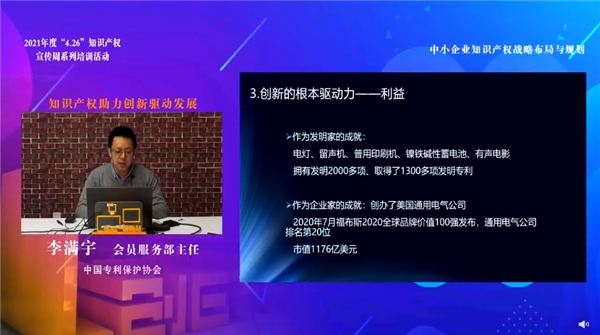 中国专利保护协会李满宇主任从人类创新发展历史、知识产权的属性以及如何通过知识产权助力企业创新驱动发展角度全面解析企业知识产权保护的必要性。李满宇主任表示产品的高附加值利润主要来源于知识产权,知识经济时代,知识产权已经超越有形财产成为企业最主要的财产形式之一,知识产权以及无形资产已经占到全世界所有上市公司资产总额的80%以上,同时成为法律赋予企业维护竞争优势最有力的工具。