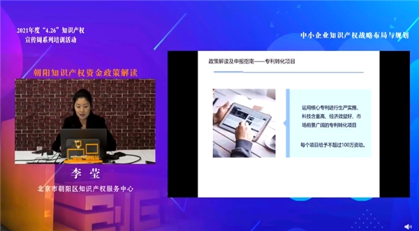世界未来的竞争就是知识产权的竞争,在创新驱动发展的今天,知识产权战略是企业长期发展战略,加强企业知识产权运用、促进科技成果转化,对提升企业竞争力起至关重要的作用。2021年度“4.26”知识产权宣传周系列培训活动共分为8场,首场活动之后,4月中下旬,我们还将围绕知识产权申请及保护策略、知识产权挖掘与布局实战培训、知识产权培育与风险防范等7个主题,陆续开展7场知识产权专题培训以及朝阳区知识产权政策解读,欢迎大家持续关注我们的微博公众号。