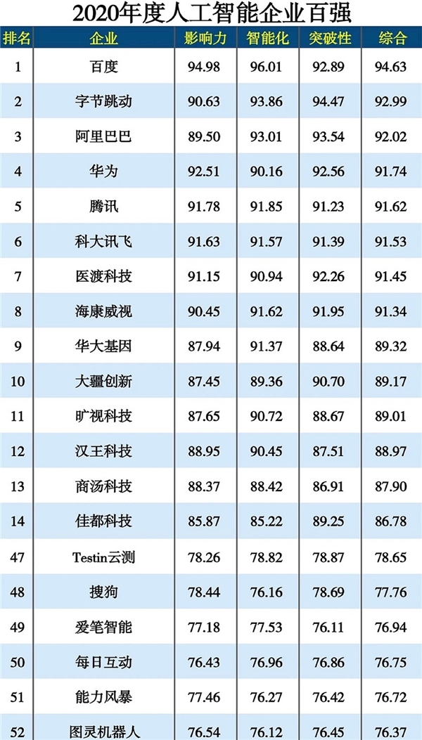 4月9日,由互联网周刊&eNet研究院评选的“2020年度人工智能企业百强”榜单出炉。Testin云测、百度、阿里巴巴、华为、科大讯飞等在人工智能领域有卓越成就的科技企业共同入围。