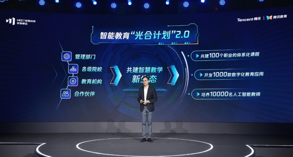 “教育信息化已从‘工具驱动’转变为‘数据驱动’,从单一的教学工具,迈向以数据应用提升整体教学能力、助力个性化发展的新阶段。”腾讯高级执行副总裁、云与智慧产业事业群总裁汤道生说。在新阶段下,腾讯教育也在峰会现场宣布,将在主管部门的指导下,与各级院校、教育机构、合作伙伴,携手推出“光合计划2.0”:腾讯教育将与行业共建100个职业的体系化课程、助力行业开发1000款数字化教育应用、助力培养10000名人工智能教师。