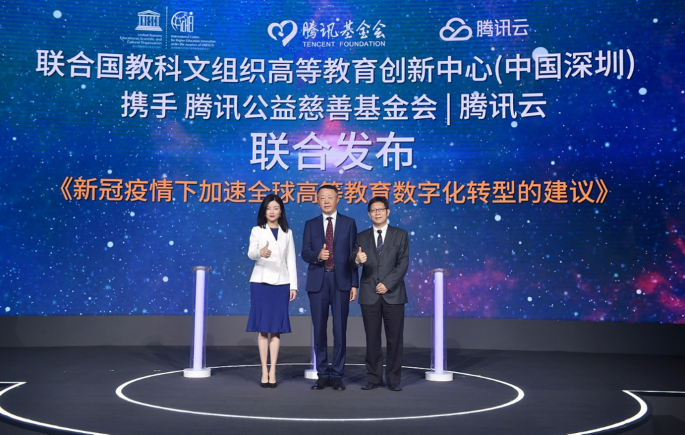 同时,联合国教科文组织高等教育创新中心也与腾讯公益慈善基金会在现场发起联合倡议,并发布2020年国际网络教育学院(IIOE)年度会议成果文件——《新冠疫情下加速全球高等教育数字化转型的建议》,希望以此激励和引领全球高等院校,努力实现高等教育的数字化转型。联合国教科文组织高等教育创新中心主任李铭,腾讯公益慈善基金会副秘书长窦瑞刚,腾讯云副总裁、腾讯教育副总裁付曼青等参与仪式。李铭在发言中强调了未来教育发展中科技企业的重要性。他指出,后疫情时代的教育重建将更加依赖科技企业的技术支持,为需求最多的国家、院校和人群适配软硬件设施与开放教育资源。