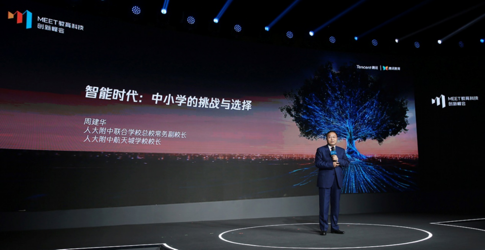 人大附中联合学校总校常务副校长、人大附中航天城学校校长周建华进一步阐释了人工智能为教学带来的助推作用。在周建华看来,在人工智能背景下,未来学校将拥有技术赋能、思想智化和管理创新的机遇。“未来学校的形态可能是智能学校,可能是智慧学校,也可能是智联学校。”