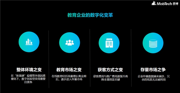 对于教育企业的现状,来自MobTech战略总监 张之遥表示,当下的教育企业面临着4大变化,分别是①整体市场之变:在“新基建”疫情等外部因素催化下,数字化转型变得重要且紧急;②教育市场之变:在线教育经历流量增长黄金期后,逐步进入存量市场加快在线教育企业的数字化转型迫在眉睫;③获客方式之变:获客费用与推广费用逐渐升高降本增效是关键;④存量市场之争:企业存量数据越来越多,冗余的线索无法被利用;这些因素都在加速推动教育企业数字化变革的步伐。