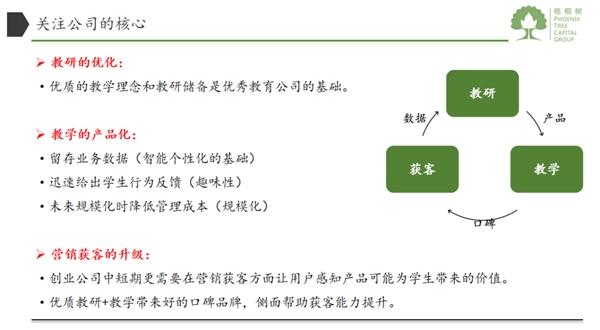 面对当下的在线教育投资环境,来自梧桐树资本的投资总监 马龙从投资者角度解析了未来在线教育的发展趋势及投资机会。他认为未来教育行业是以“产品+技术为核心+人”来产生规模效应。优质的教学理念和教研储备将是优秀教育公司的基础,对于创业公司来说,在中短期更需要在营销获客方面让用户感知产品可能为学生带来的价值。其中优质的教研+教学可以带来好的口碑品牌,侧面帮助获客能力提升。