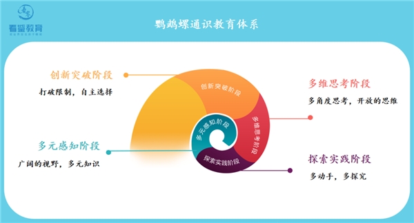 因此看鉴教育研究出了鹦鹉螺通识教育体系:首先是多元感知阶段,这个阶段是希望孩子能够去探索更多的内容,感知世界的万事万物;其次是探索实践阶段,让孩子去多动手,把它感知到的一些东西去做实践、尝试;第三个是多维思考阶段,在孩子探索之后就会对很多的内容有了新的想法;最后一个是创新突破阶段,我们希望孩子能达到一个自我创新,有自己的意识与想法,因为在这个时候,他们才会有更多的独立思考去自主去做选择。