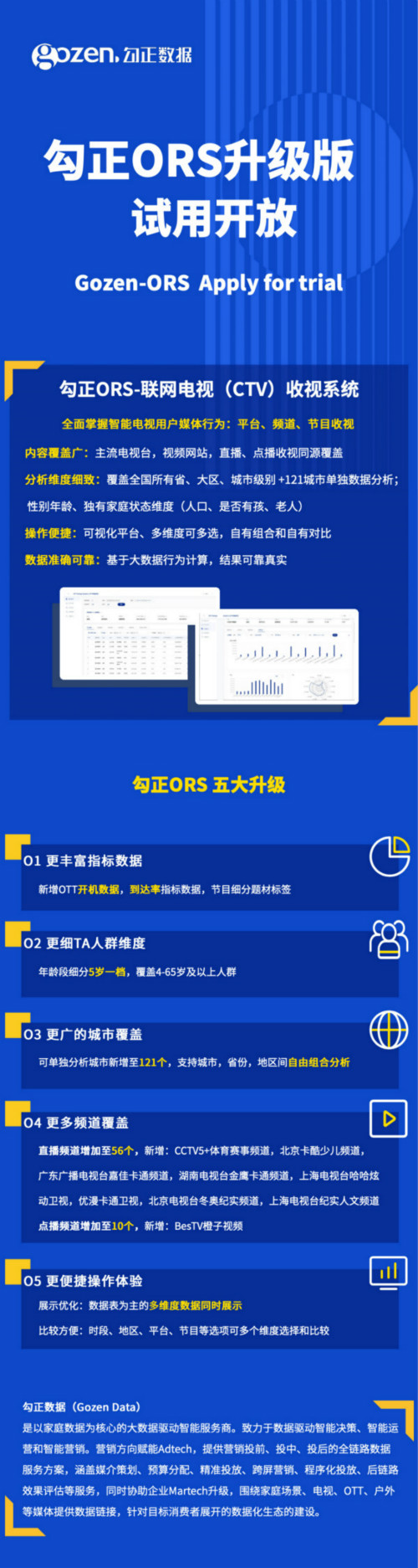 勾正数据日前宣布,勾正ORS升级版试用正式开放,升级后的版本可免费试用,给用户提供了更具体验感的服务模式。