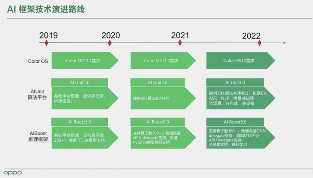 OPPO 最早于2019 年开始 AI 框架探索,目前主要包含 AI Unit 算法平台和 AI Boost 推理框架两大模块。在公开的Roadmap 中,AI Unit 算法平台未来将提供更多的算法 API 接口,包括 CV、ASR、NLP、情景感知等,覆盖全场景,支持分布式、多设备运行;AI Boost 推理框架将支持更多算子数、支持高通 QNN delegate、MTK平台 APU delegate,也将向全场景支持、联邦学习迈进。