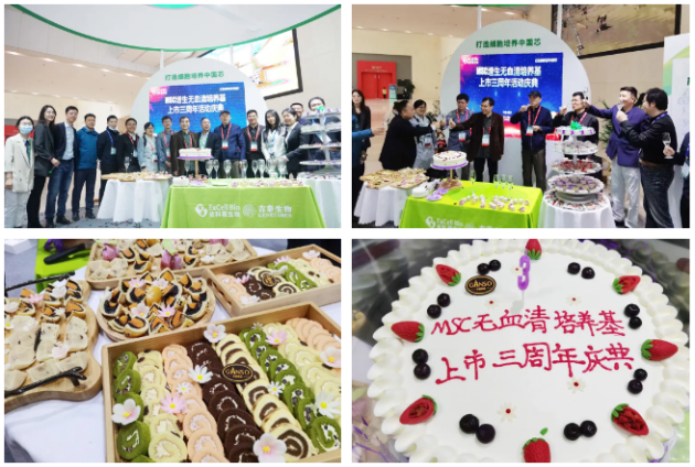 4月15日上午,依科赛生物SFM系列产品之一——MSC增生无血清培养基上市三周年庆典在展台隆重举行,裴钢院士、陈晔光院士、朱剑虹教授、高绍荣教授、冯新华教授、杨瑾老师等专家莅临指导,与依科赛生物高管团队共同见证了这一荣耀时刻。