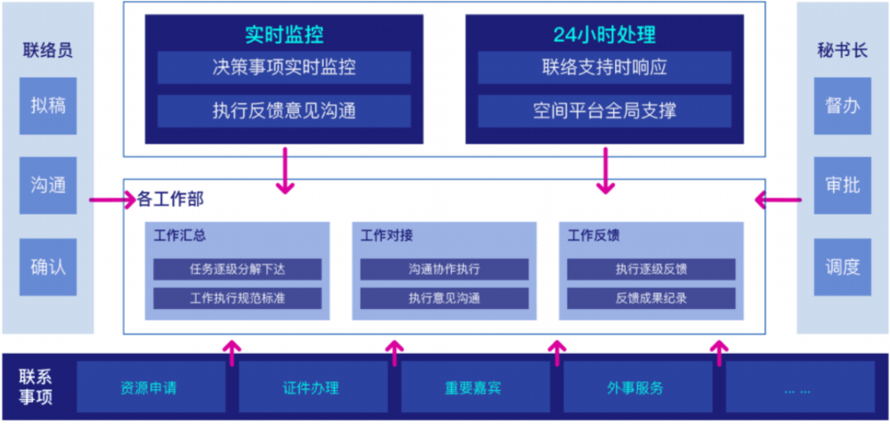 秉承着电科集团赋予的使命,慧点科技 E和音智慧会展团队积极响应海南省外办等单位的要求,为本届博鳌亚洲论坛年会提供信息化保障。本届博鳌亚洲论坛参会嘉宾涵盖了国家领导人、政要,国际组织负责人,学术、企业、媒体、文体、宗教等各界代表,在政治性、安全性方面要求严格。同时,由于筹备时间紧、计划变动多、对接事项杂等因素,其组织筹备工作异常复杂。职能单元既要各司其职,又要沟通配合,如何合规、有序、高效的协同,支撑大会的顺利筹备,就是需要重点解决的问题。