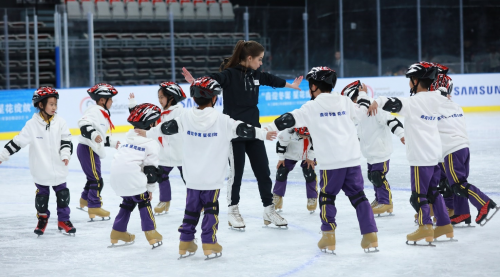 启动仪式前,孩子们接受专业教练团的冰上技术指导