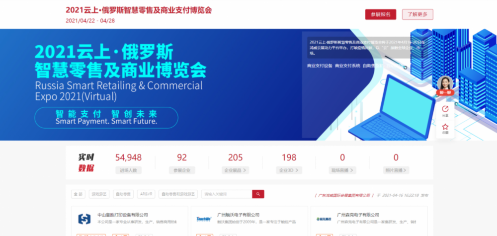 外贸企业出海,云上展会再发力。4月22日,万众瞩目的2021云上·俄罗斯智慧零售及商业博览会正式开幕。本次博览会为期7天,汇集了上中下游各路客商,开展首日聚集了92家新零售企业,全球54948人次云上实时观展。