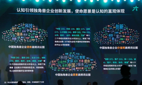 其中中国/全球和科技/服务是重合度最高的关键词,彰显了独角兽企业在全球/中国市场的特定领域,以科技/服务改变世界、让人类生活更美好的驱动力。