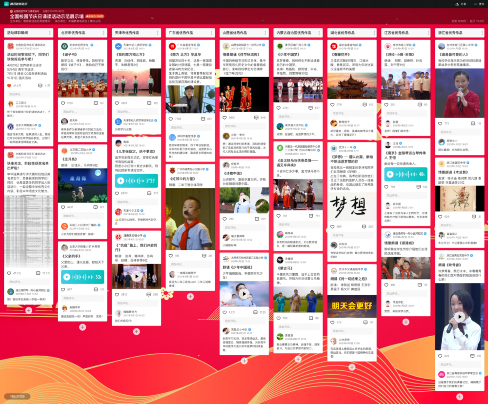 基于上述原因,今年4月,教育部语用司主办,中国教育电视台和腾讯教育承办的经典诵读活动正式启动。根据规划,活动将贯穿全年,联动百县(市)千校的师生共同分享诵读作品。