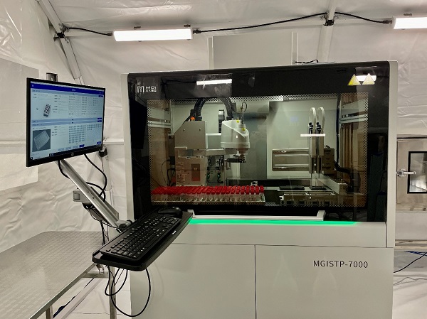 “普济号”负压硬气膜实验室强大检测能力背后的硬核科技支撑,源于华大智造自主研发的抗疫设备——全自动MGISTP-7000分杯处理系统,能实现自动化样本条码扫描、录入和样本分装程序。操作时全程样本零接触,可在40分钟内完成192样本的分装以及信息处理,解决了核酸检测中最耗费人力和感染风险最高的样本分装工序工作。