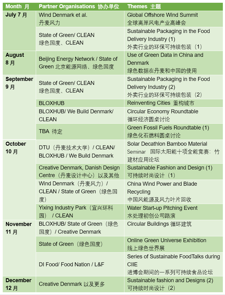 绿色峰会由丹麦王国驻上海总领事馆、丹麦投资促进局、商务部、丹麦科技创业中心(上海)支持举办,并将持续推出绿色峰会(Green Summit)系列活动,活动排期如下列表,敬请关注!