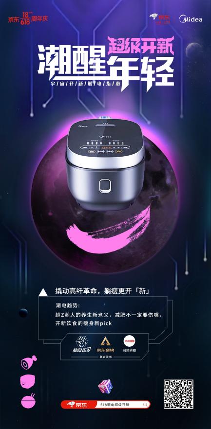 作为线上购物的主流平台之一,京东精准洞察了Z世代的消费心理,618期间上线了一个新项目——“超级NEW计划”,以“超级开新,潮醒年轻”为主题,围绕Novelty(新奇特)、Experience(新体验)、Wave(新浪潮)三大理念与品牌深度共建产品,比如Z世代不爱做家务,却喜欢精致的有品位的生活,像扫地机器人、洗地机、洗碗机、免拆器油烟机、自清洁关空调等都是他们偏好的产品。对形象格外在意,在Z世代的潜意识中个人形象是最重要的态度表达,各种美容设备、按摩设备、养生小电器在Z世代中特别吃香。所以此次京东小家电联合京东唯一权威榜单IP——京东金榜,为京东旗下的新品发布、新奇特趋势新品、新用户群体打造了「宇宙超级开新潮电指南」,用潮流新品传达致敬年轻、不辜负每一份热爱的新时代生活态度,借由小家电的便捷治愈体验,为年轻一代传递开新能量!
