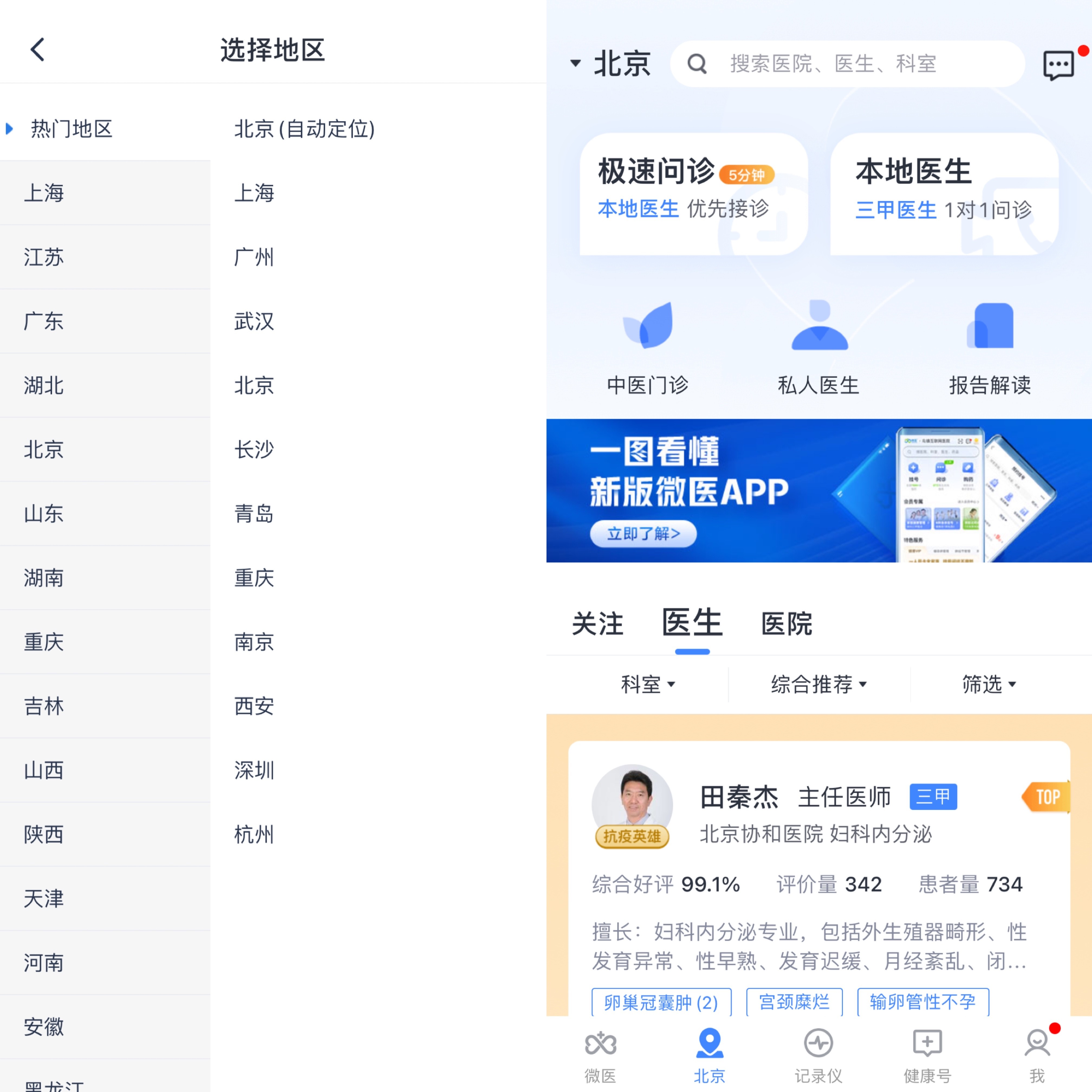 (用户可选择自己所在地域,快速找到家门口的好医生)