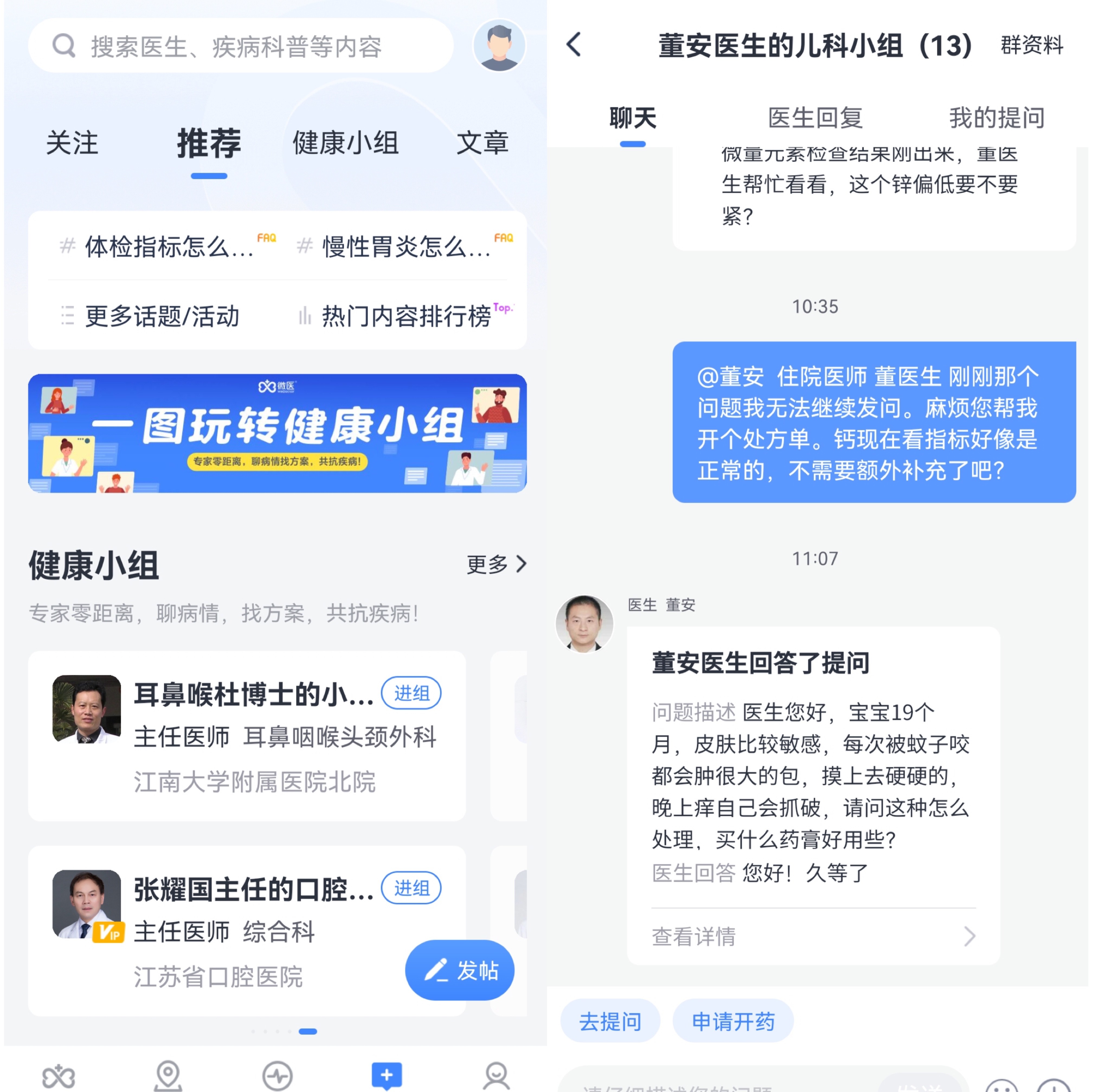 此外,此次改版还全新上线了医患深度沟通小工具“健康小组”,用户可以在微医App上加入医生组建的“社群”,与专家零距离沟通,随时随地找医生询问病情,同时还能与病友交流病情及治疗方案心得,共抗疾病 。