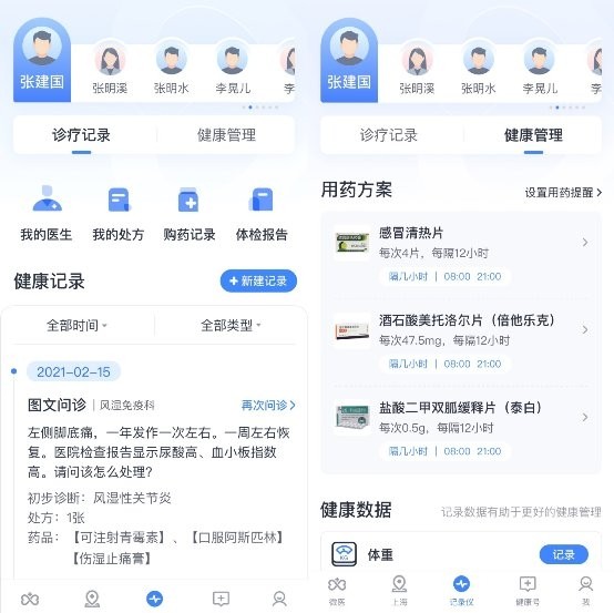 以往家人在医院就诊的各种单据凌乱无序、家中常有不知道是治疗什么病症的药品、去医院看病无法清楚描述病史和病程……此次上线的“记录仪”功能,让健康“有迹可循”——用户可以为自己和家人上传历史就诊信息、购药信息及健康数据,还能记录日常用药,设置智能提醒用药。随后无论在线上、线下就医,均可随时查看过往就诊记录和健康信息,便于医生快速且详细了解用户健康状况,相应给出诊疗意见。