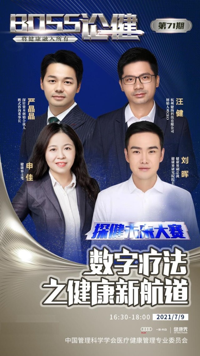7月9日,杭州健海科技有限公司创始人、CEO 汪健,探针资本创始合伙人、胜式咨询董事长 严晶晶,健康界副总裁、健康界研究院院长刘晖做客健康界原创品牌节目《BOSS论健》,共话数字疗法开启的健康新航道。