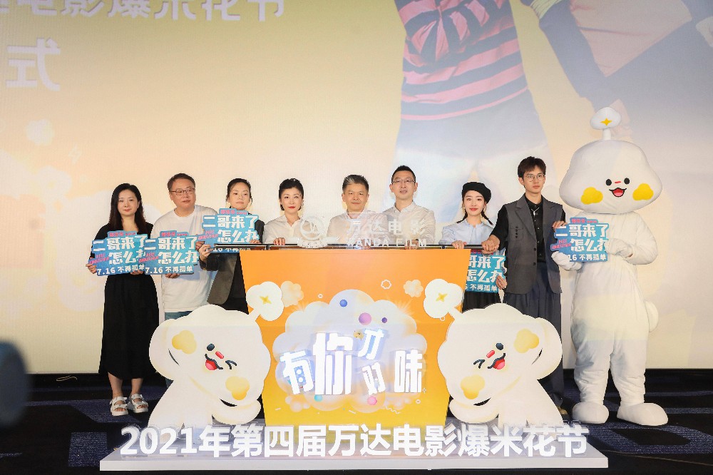 在2021年第四届万达电影爆米花节活动的启幕现场,由万达文化集团总裁兼万达影视集团总裁曾茂军先生、万达文化集团副总裁兼万达电影执行总裁陈洪涛先生、五洲电影发行有限公司总经理周蓓女士与影片《二哥来了怎么办》的主创人员共同完成了本届万达电影爆米花节的启幕仪式。