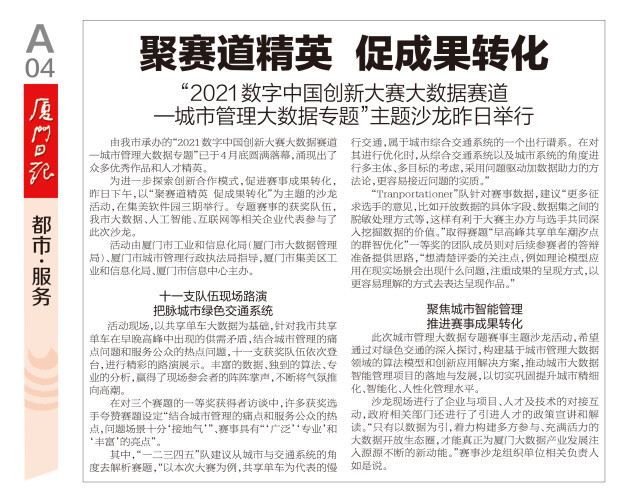 由厦门市承办的“2021数字中国创新大赛大数据赛道-城市管理大数据专题”已于4月底圆满落幕,赛事涌现了众多优秀作品和人才精英。